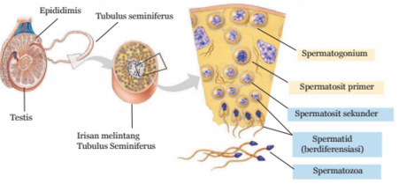 SpermatogenesisProses pembentukan sperma disebut dengan spermatogenesis.Pembentukan sel sperma terjadi di dalam tubulus seminiferus. Kata “tubulus” berasal dari kata “tubula” yang artinya saluran, sedangkan kata “seminiferus” berasal dari kata “semen” yang artinya sperma. Jadi tubulus seminiferus adalah saluran panjang yang berkelok-kelok tempat pembentukan sperma. Proses pembentukan sperma pada saluran tersebut terjadi secara bertahap. Diawali dari sel induk sperma atau spermatogonium yang bersifat diploid (2n). Selanjutnya, sel spermatogonium mengalami pembelahan secara mitosis maupun meiosis dan mengalamidiferensiasi atau perkembangan sehingga terbentuk sel sperma atau spermatozoa yang memiliki ekor. Sel sperma yang terbentuk tersebut bersifat haploid (n).