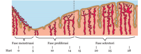 Fase pertama adalah fase menstruasi, pada fase ini hormon FSH (follicle stimulating hormone) memicu berkembangya folikel dalam ovarium.Pada awal perkembangannya, folikel menghasilkanhormon estrogen dan hormon progesteron. Hormon estrogen dan progesteron ini akan memicu dinding rahim untuk menebal.Pada saat ini dinding rahim sedang mengalami fase proliferasi. Tujuan dari menebalnya dinding rahim adalah untuk mempersiapkan tempat melekatnya embrio apabila sel telur dibuahi oleh sperma. Fungsi lain dari hormon estrogen adalah memicu kembali kelenjar pituitari untuk menghasilkan hormon FSH dan LH Hormon. LH terus diproduksi dan meningkat secara mendadak. Peningkatan hormon LH ini akan memicu pengeluaran sel telur dari folikel yang telah matang, proses ini disebut ovulasi.Fertilisasi dan kehamilan